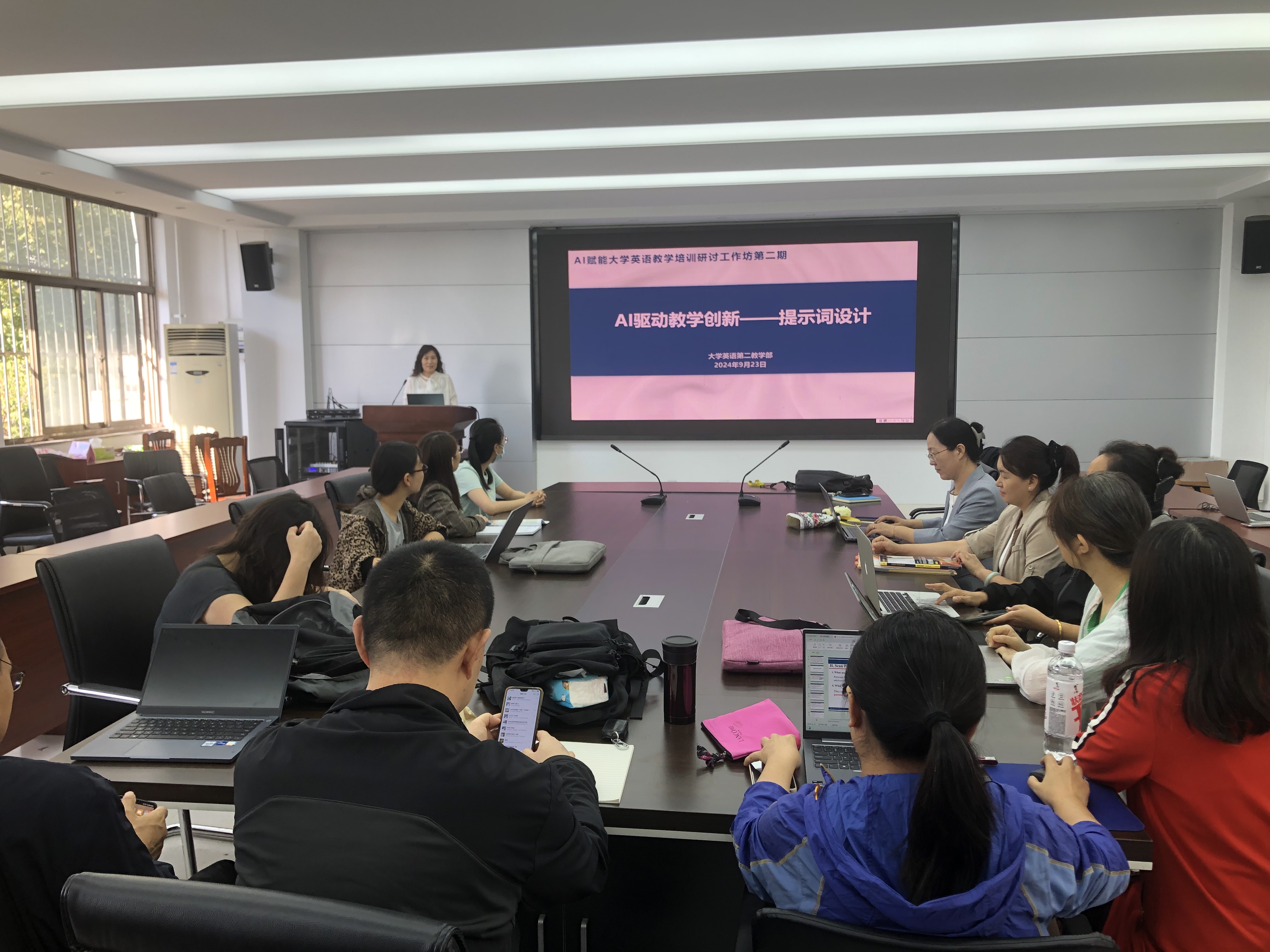 为扎实推进国家教育数字化战略行动,将人工智能技术新优势转化为教学改革发展的新动能,积极探索“AI+教育”在专业与课程建设中的深度融合路径,2024年9月23日太阳成集团大学英语第二教学部在文经楼C220进行AI赋能大学英语教学培训研讨工作坊,本期活动主题为AI驱动教学创新——提示词设计,由大学英语第二教学部主任聂庆娟主持并带领全体教师进行AI实操训练。