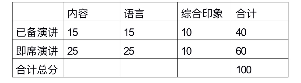 2.即兴演讲:2分钟,选手将当场抽题,拥有2分钟的准备时间,准备时间结束后完成即兴演讲。