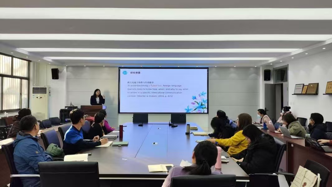 王青副教授讲座的题目为“探究跨文化能力的组成要素:以数据建模为研究方法”。王青分析了高等教育背景下跨文化交际能力的组成要素。讲座汇报的内容基于Byram(1997)的理论模型,以数据建模(structural equation modelling)为研究方法,测试跨文化交际能力各组成要素之间的相互关系。本研究结果也为外语教学中学生跨文化交际能力的培养提供了实证依据。他用浅显易懂的语言将看似复杂的语言学理论模型讲解得透彻清楚,使老师、学生们明白了做学问除了具有创新意识外,还要具备“不仅要让自己明白,而且还要让别人明白”的能力。