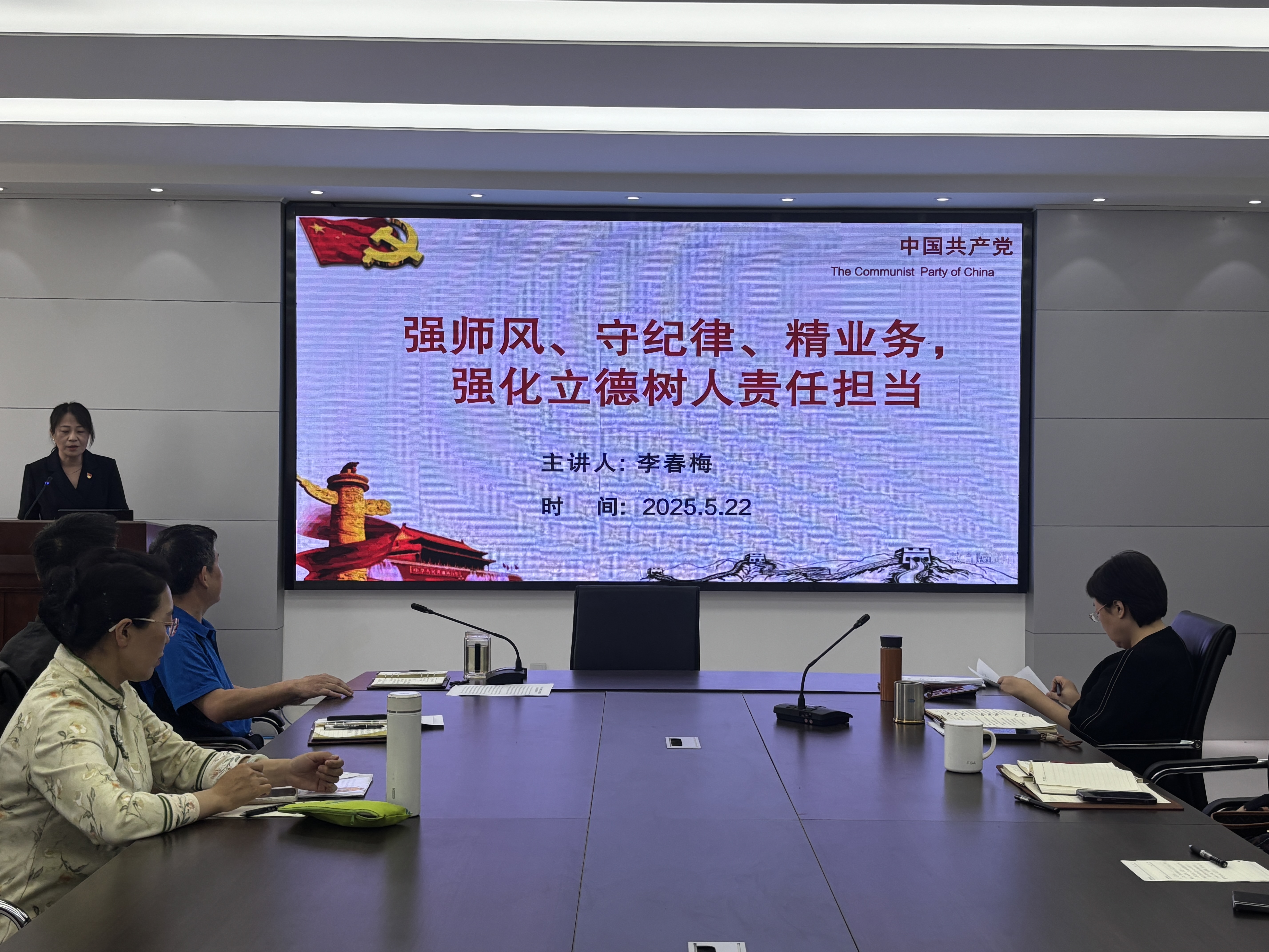 李春梅以《强师风、守纪律、精业务,强化立德树人责任担当》为题讲授专题党课,带领全体教师深入学习了中央八项规定,并对教职工提出了三点建议,一是要强师风,树立良好形象;二是要守规矩,筑牢思想防线;三是要担使命,勇于担当作为。