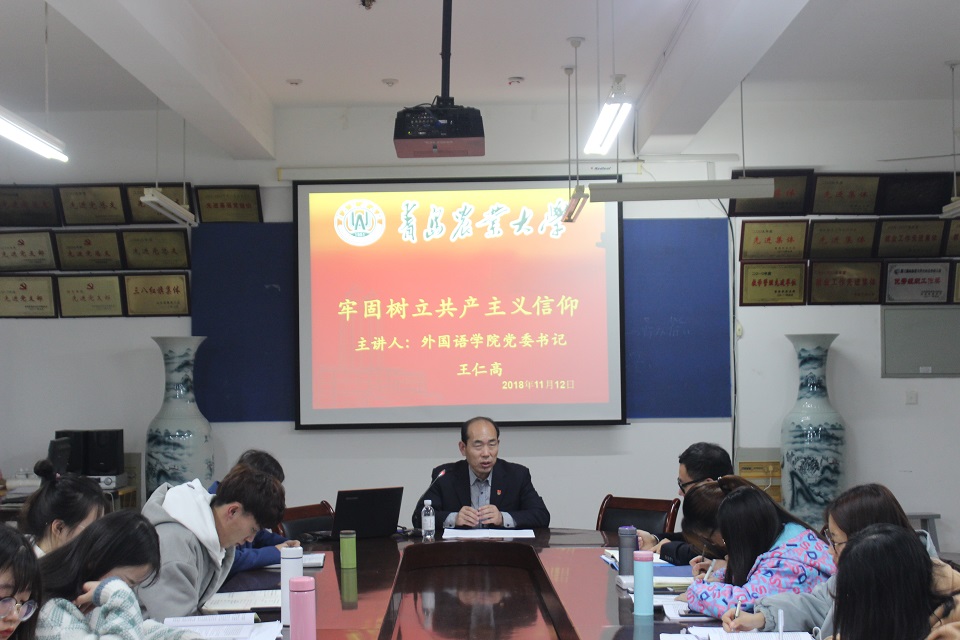 11月12日,太阳成集团-www.tyc234cc.com(中国)有限公司于文经楼会议室举行以“牢固树立共产主义信仰”为主题的党课学习。本次党课由院党委书记王仁高主讲,正科级辅导员刘艳及全体在校生党员参加学习。