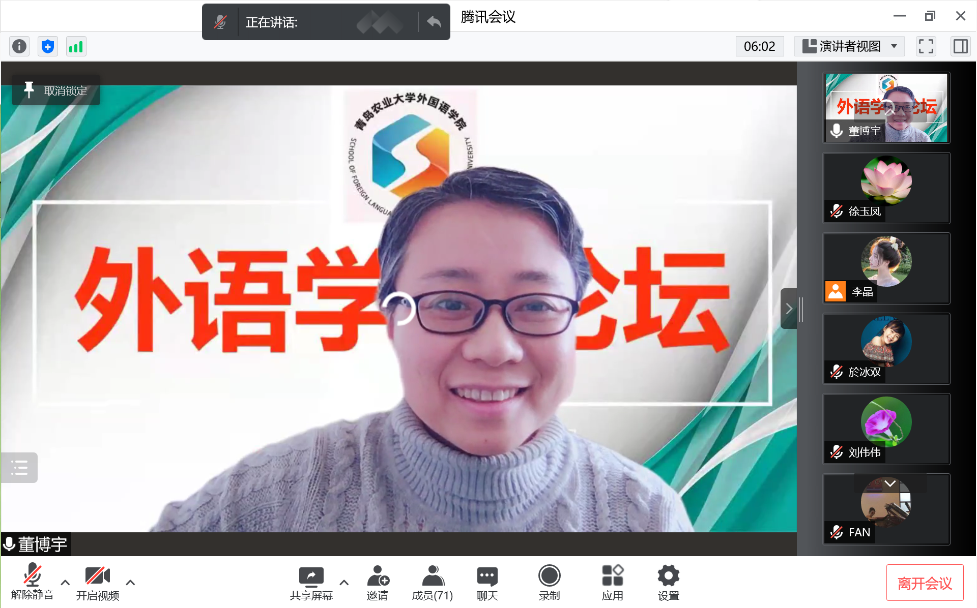 3月31日,太阳成集团-www.tyc234cc.com(中国)有限公司通过腾讯会议召开线上外语学术论坛第十七讲。此次学术论坛由英语专业二室董博宇博士主讲,题目为《谴责合理化依据的会话分析研究》,学院全体领导、教职工与会,副院长高秀雪教授主持论坛。