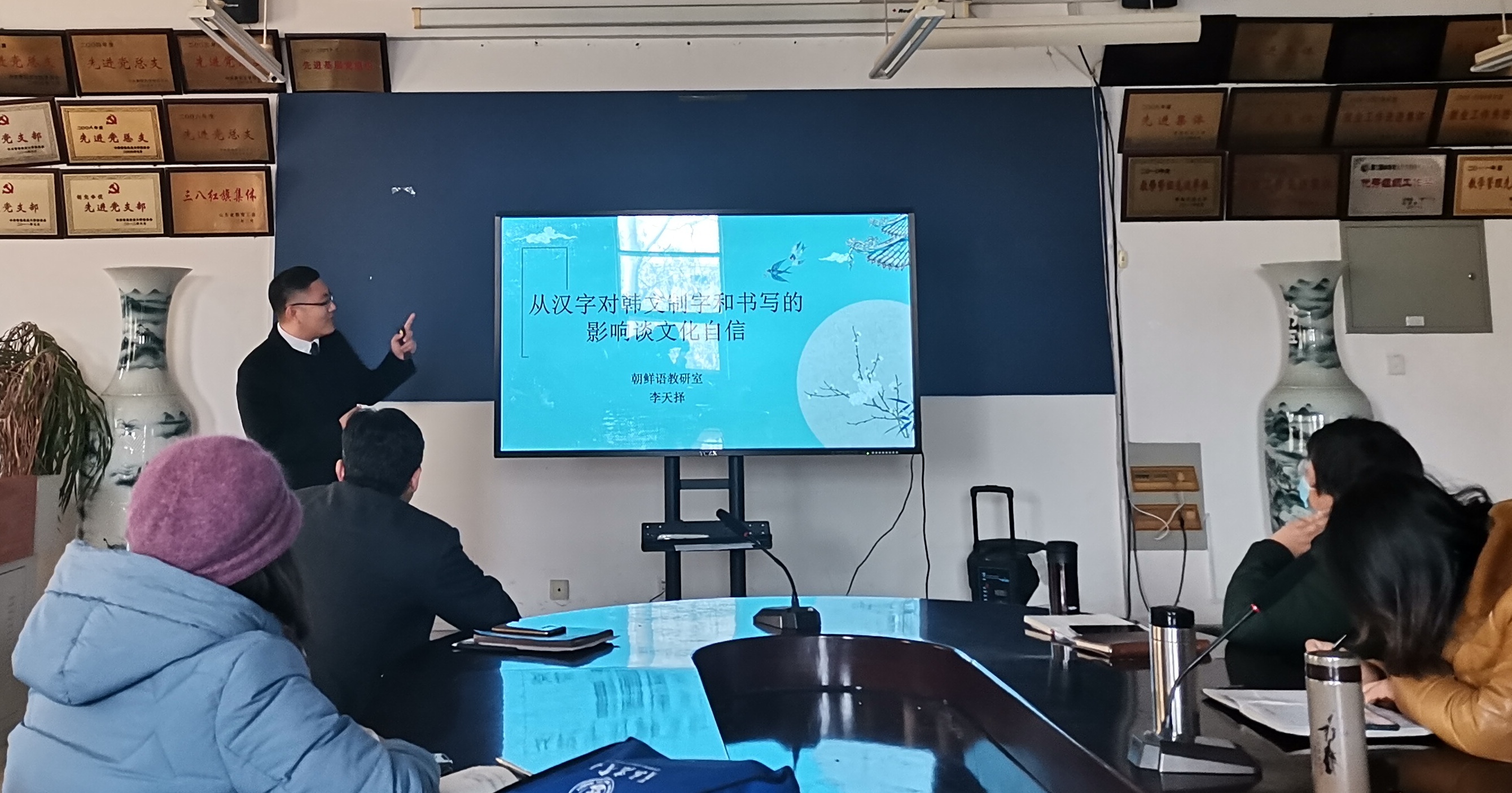 12月17日,太阳成集团-www.tyc234cc.com(中国)有限公司于文经楼会议室开展外语学术论坛第十六讲。此次学术论坛由毕业于韩国高丽大学的李天择博士主讲,主讲题目为《从汉字对韩文制字和书写的影响谈文化自信》,学院全体领导、教职工与会,副院长高秀雪教授主持论坛。