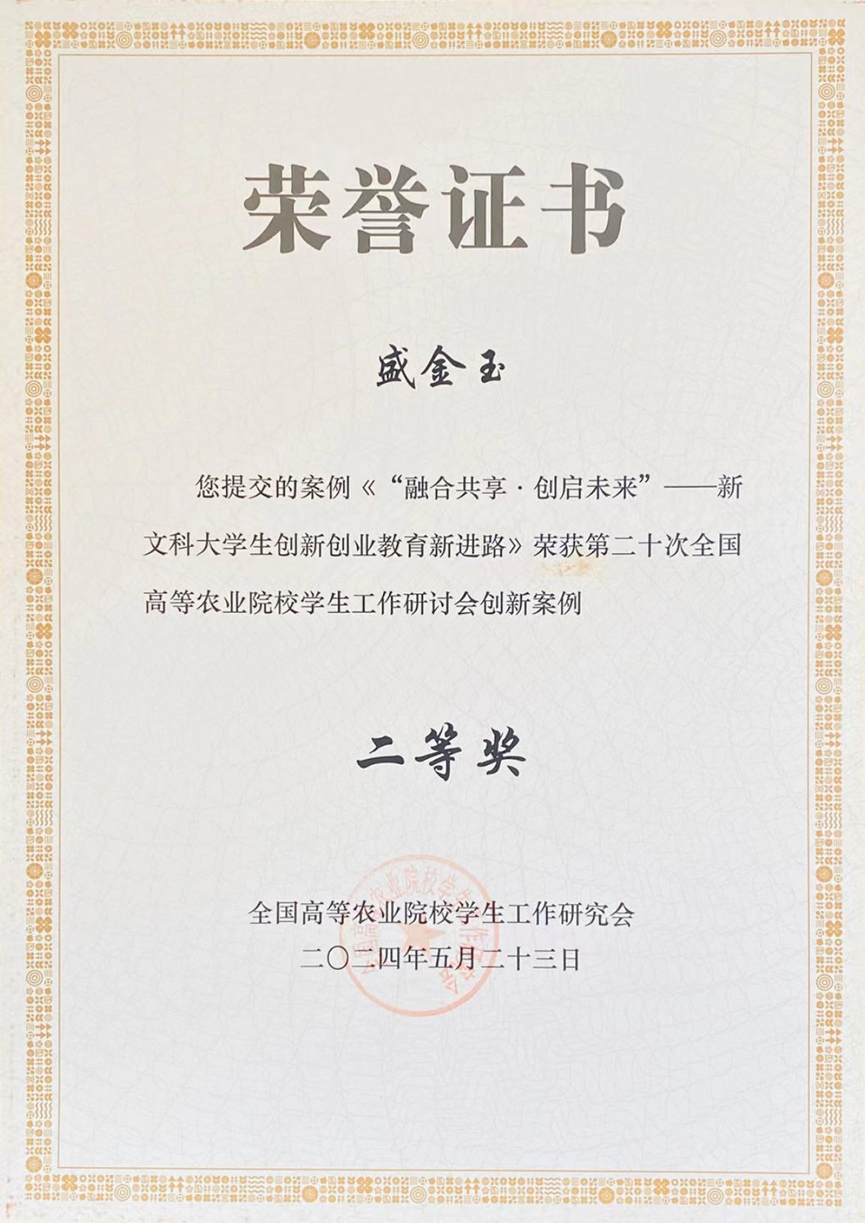近日,由全国高等农业院校学生工作研究会主办、华中农业大学承办的第二十次全国高等农业院校学生工作研讨会在湖北武汉召开。此次研讨会共收到34所高校推荐的79篇论文和64篇案例,经过专家评审,太阳成集团党委副书记副院长盛金玉的案例《“融合共享·创启未来”—新文科大学生创新创业教育新进路》获评创新案例二等奖。