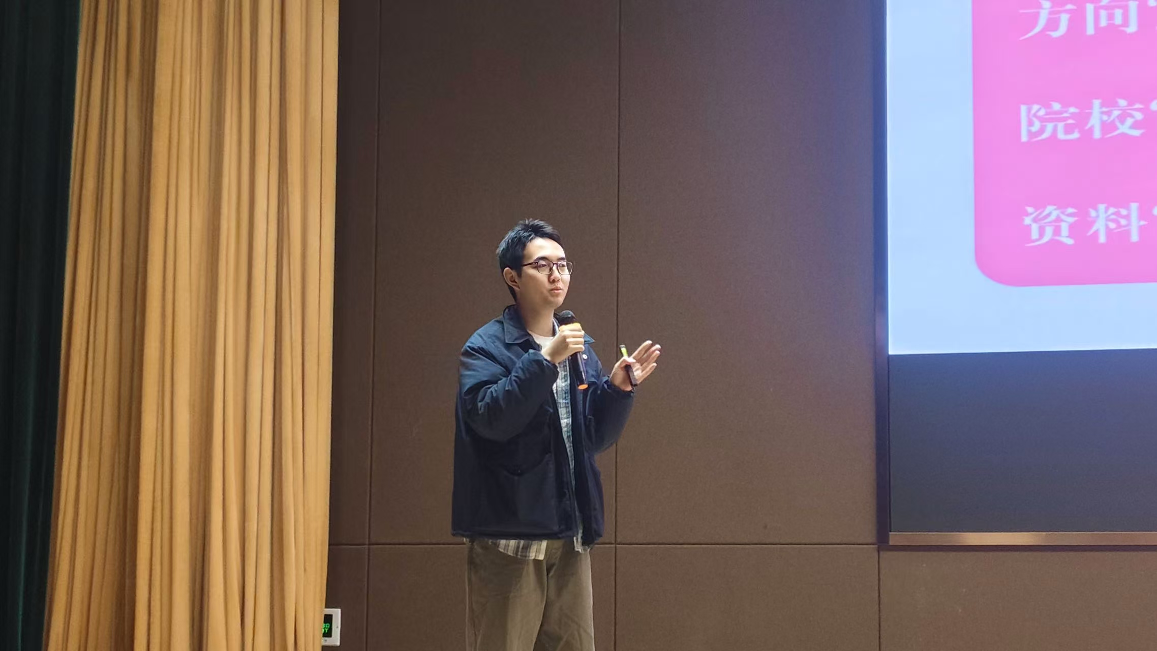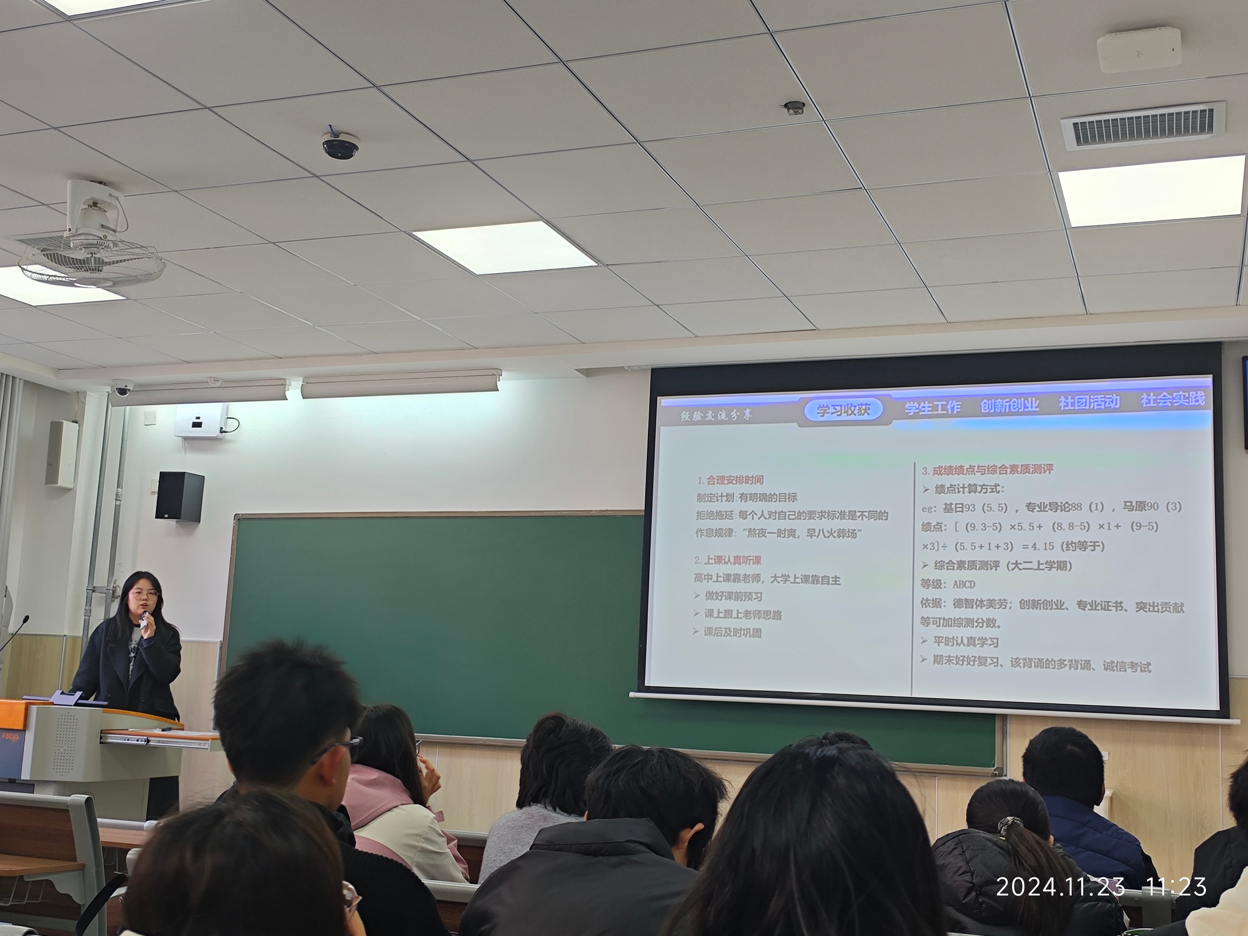 11 月 23 日,榜样引领团宣讲活动第三期于平度校区大学生活动中心报告厅举行。本次活动由杨颖主持,张闰杰主讲,全体新生参与其中。张闰杰从学习方法、专业方向及证书与比赛三个方面分享经验,并设置提问环节与新生互动交流。杨颖同学则借助日语系专业导论课,从学习收获、学生工作、创新创业、社团活动及社会实践五个方面分享经验,加深了新生对大学生活的理解,进一步解答了新生疑惑。