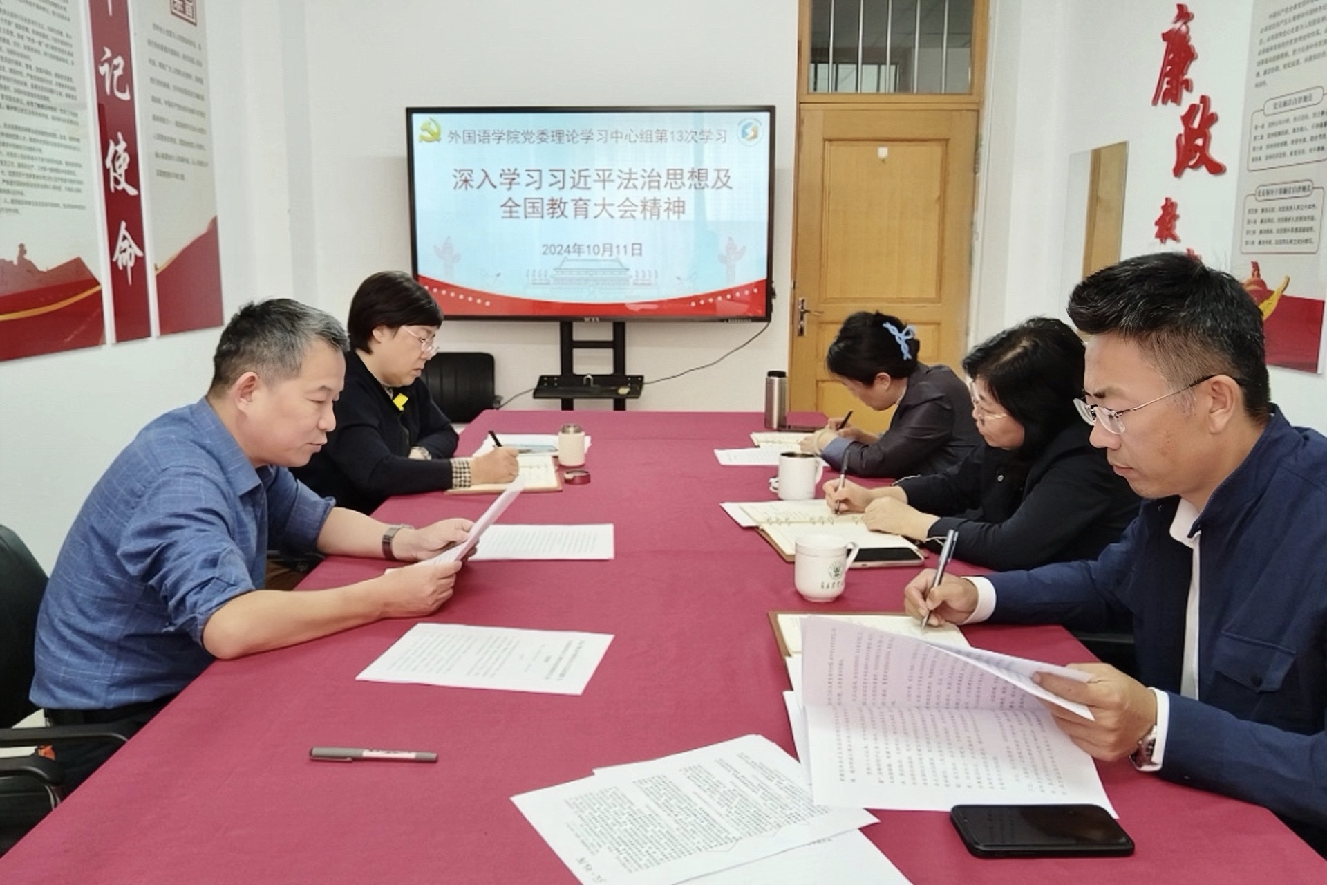 10月11日,太阳成集团召开党委理论学习中心组学习,深入学习领会习近平总书记关于法治工作重要指示批示精神及全国教育大会精神。会议由太阳成集团党委书记王效仿主持,学院党委班子成员参加。