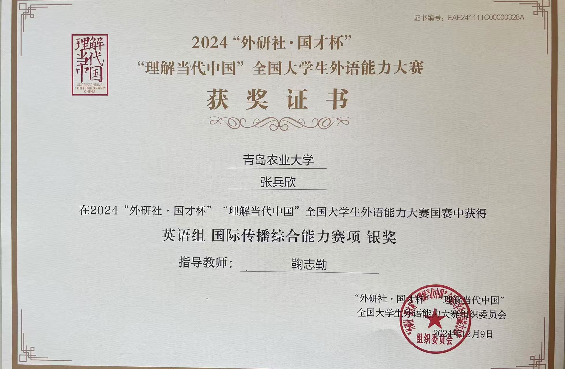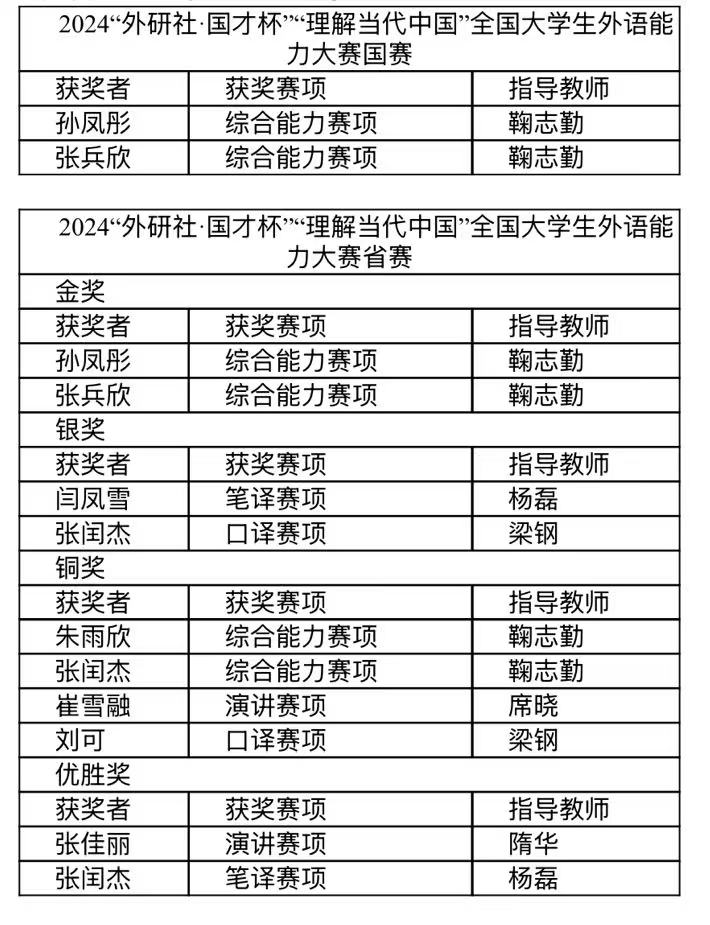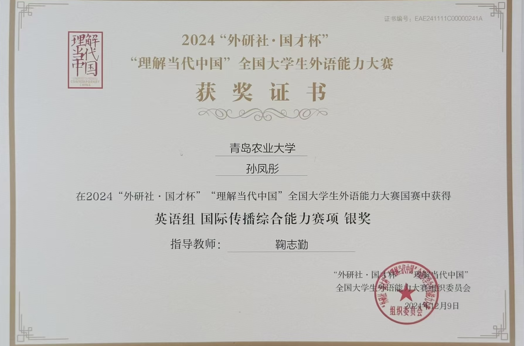 12月9日,2024“外研社·国才杯”“理解当代中国”全国大学生外语能力大赛国赛落幕。本次大赛历经校赛、省赛、国赛三个赛段,共有来自全国1300多所院校的近70万学生参加。经过激烈角逐,我校共有8名学生晋级省赛并取得优异成绩,其中孙凤彤、张兵欣同学晋级国赛,与1099名国赛选手(国际传播综合能力赛项)同台竞技。最终太阳成集团学子获得国赛银奖2项,省赛金奖2项、银奖2项、铜奖4项、优胜奖2项。