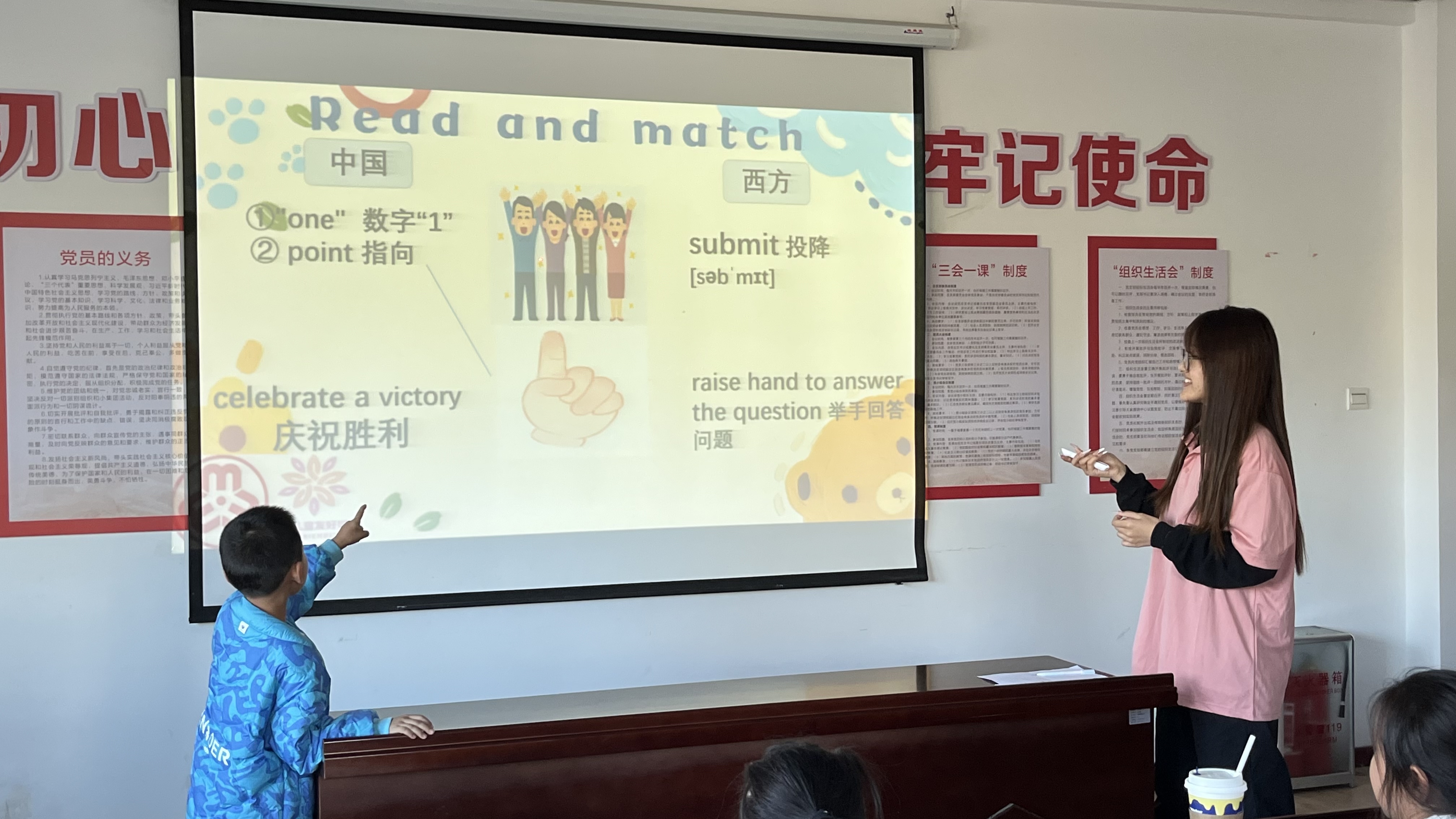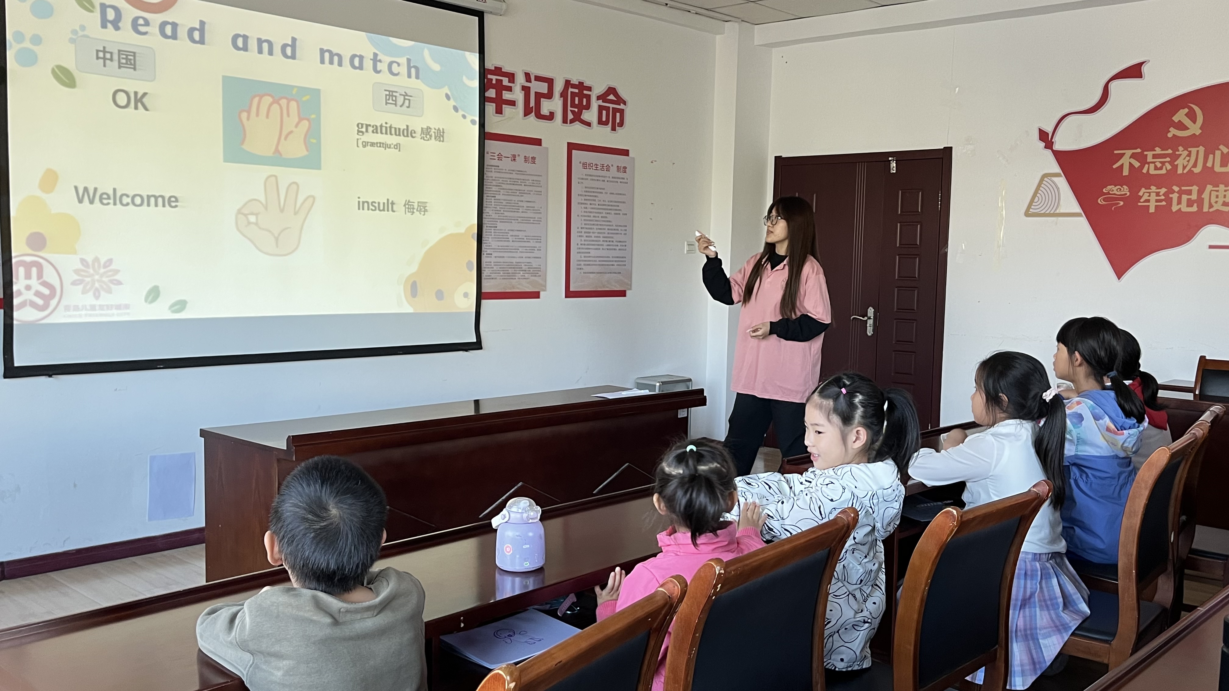 本次课堂以中西方手势语言表达的差异为主题。授课前,志愿者提前到达社区布置现场。课堂上,志愿者采用“寓教于乐”教学方式,由一段文化差异小视频引入课堂主题,向小朋友们展示了同一手势在不同国家日常生活中的不同含义。授课后,志愿者设计了游戏环节,通过“击鼓传花”来巩固和检验小朋友们的学习成果。