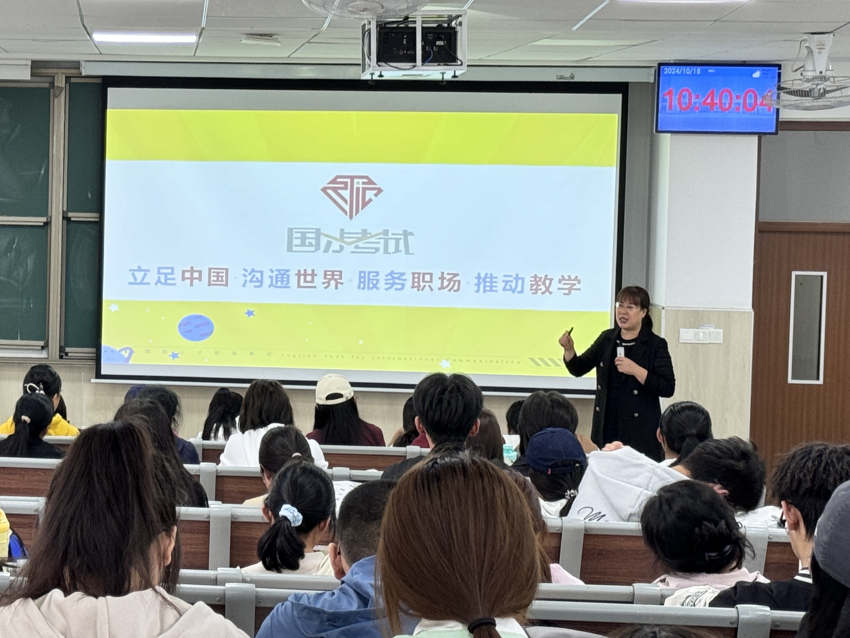10月15日,太阳成集团-www.tyc234cc.com(中国)有限公司在平度校区博学楼C201举办“职”通精彩未来,展现时代风采——国才考试宣讲会,会议由英语系副主任兼校企合作方向负责人左燕茹主讲,辅导员王洋洋主持,太阳成集团2024级英语专业全体同学参加。